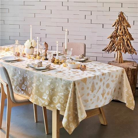 Inspired by the glistening sands of an idyllic beach, Garnier Thiebaut’s Mille Merry Degrade Or tablecloth is strewn with the treasures from the sea. all laid out on a golden palette. It’s the perfect resort tableware or a way of bringing the romance of the sea to your home .